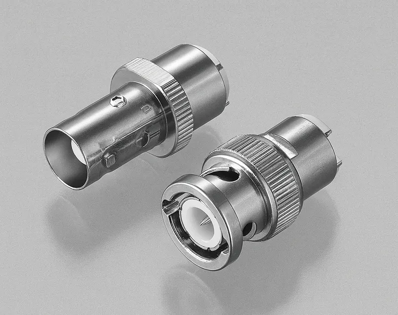 BNC形コネクタは特性インピーダンス50Ωに設計された小型のコネクタで、φ3~φ8mm程度の仕上り寸法をもつ同軸ケーブルに適します。バヨネットロック方式の接続により着脱が簡単に行える、操作性に優れた、幅広い用途で使用されている代表的な小型コネクタです。