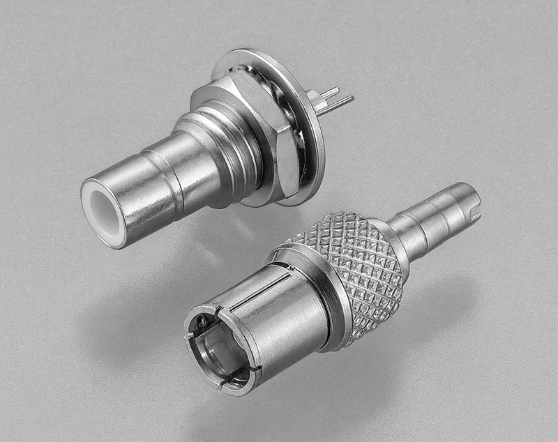 MQ形コネクタは特性インピーダンス50Ωに設計された超小型のコネクタで、φ3mm程度の仕上り寸法をもつ同軸ケーブルに適します。TSB形と同じ規格の結合部分をもつ、プッシュオン方式のコネクタで、TSB形より簡素化された構造の安価なコネクタです。MQ形コネクタの結合部を機械的に保護し、且つ結合時の異常なテンションに対しても、十分に対応出来るように改良したMQSタイプもあります。